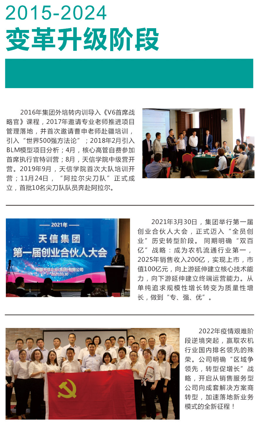 公司自2018年轉型升級以來,逐步從傳統(tǒng)的農機銷售服務向成套農業(yè)機械化解決方案商轉型,通過5年的變革發(fā)展,2022年公司進一步明確了戰(zhàn)略發(fā)展定位,打造“從耕種到收獲的全產業(yè)鏈綜合服務解決方案商”雙百億戰(zhàn)略的新目標。